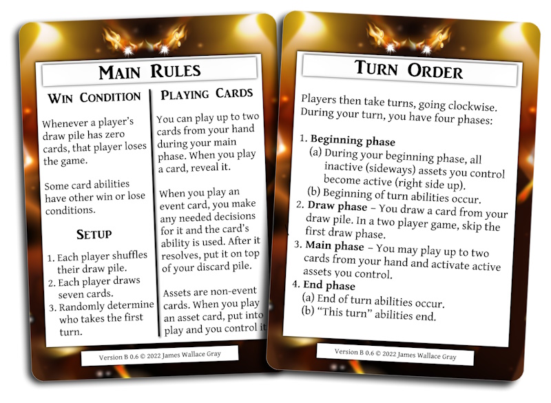 The first version of the game has some amount of combat built into the game, and it has swift cards, which can be played at any time, even during the turn of an opponent. The second version of the game is greatly simplified, and that is the one we think is the most promising at this point. However, both versions of the game are untested. We are focuses on the second version in this post.
