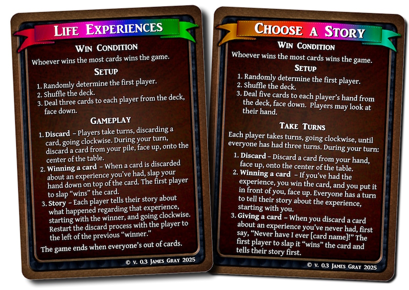 Life Experiences is being developed by James Wallace Gray. It is nearly complete, but must be play tested. James is currently pursing a career as a school teacher, and this game was inspired by the need for icebreaker games for students.